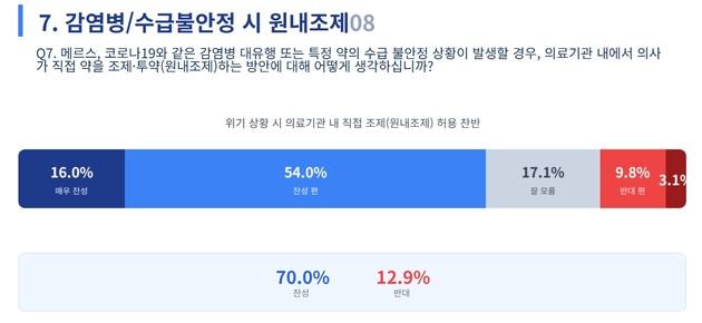 국민은 감염병 대유행이나 약 품절 사태 등 위기 상황에서 의사가 직접 약을 조제하는 '원내 조제'를 원한다고 응답했다. 70%가 원내 조제에 찬성의 뜻을, 나아가 환자가 병원 조제와 약국 조제 중 원하는 곳을 선택할 수 있도록 하자는 내용의 '의약분업 선택제'에는 무려 74.2%가 찬성의 뜻을 표시했다.