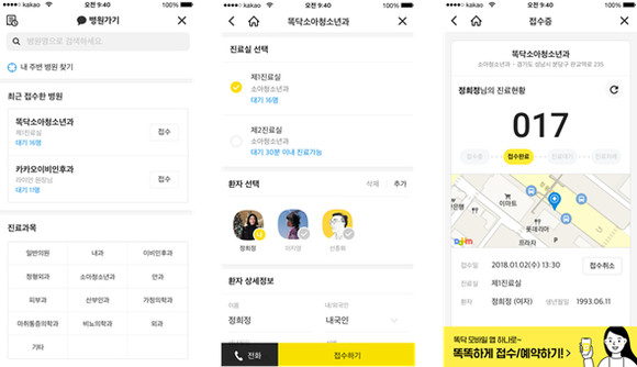기존의 ‘진료접수’ 기능은 카카오톡의 검색 기능을 활용해 개별 병의원의 플러스친구 홈을 찾아 진료를 접수하던 방식이었다. 재진 병의원의 경우 플러스친구를 카카오톡 친구로 등록하면 터치 몇 번으로 간편하게 진료를 접수할 수 있는 장점이 있으나, 갑자기 병의원을 찾을 경우 내 주변 병의원을 찾기 어렵고, 그나마 병의원명을 알아도 동명의 병의원이 다수 검색되는 등 불편했다.