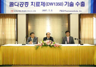 동화약품은 2일 프레스센터에서 기자회견을 갖고, P&G(Procter & Gamble Company)의 자회사인 P&G Pharmaceuticals, Inc(이하 P&GP)와 골다공증 치료제인 DW1350 및 그 후속물질의 라이선싱 계약 체결했다고 발표했다. 앞서 동화약품은 이날 9시 30분경 이를 공시했다. 이날 동화약품은 이번 계약 체결로 계약금을 포함해 미화 5억1100만 달러(한화 약 5000억원)에 달하는 기술수출료(Milestone)와 상업적 매출에 따른 로열티 수입을 올리게 됐다고 밝혔다. 특히 이는 금액규모로는 110년 국내 제약 사상 최대 규모의 신약기술 수출 건이라고 동화약품은 강조했다. 이번 계약은 동화약품의 신약 DW1350(골다공증 치료제)의 아시아 지역을 제외한 전세계 개발 및 판권을 P&GP에 양도하는 조건이다. 이와 함께 동화약품은 P&GP 및 관련회사에 중간체 및 완제품의 공급계약에 대한 추가적인 협상을 할 수 있게 된다고 부연했다. 윤길준 사장은 “P&GP는 골다공증치료제 분야에 대한 폭넓은 경험을 가지고 있는 만큼(악토넬) DW1350 및 그 후속물질의 개발에 있어 이상적인 파트너라고 생각한다”며 “이번 계약은 동화약품이 글로벌 제약기업으로 발돋움하는데 있어 중요한 전환점이 될 것”이라고 소감을 밝혔다. P&G Global Healthcare의 Tom Finn 대표는 “동화약품의 새로운 개념의 골다공증 치료제 개발을 위한 과학적인 접근 방법과 DW1350 및 그 후속물질들의 새로운 치료제로서의 가능성에 대해 깊은 감명을 받았다”며 “동화약품과의 전략적 제휴는 골관절치료제 분야의 포트폴리오를 확장하기 위한 기회를 찾고 있는 우리의 목표와 잘 부합한다”고 밝혔다. 한편, 이날 기자회견에 나선 동화약품 유제만 연구소장은 “DW1350은 현재 유럽 1상을 완료한 상태로 신개념 골다공증치료제로의 개발이 기대되는 물질”이라며 “전임상과 1상 임상을 통해 골흡수 억제와 골형성 촉진이라는 골다공증치료제의 궁극의 목적을 동시에 확인했다”고 강조했다. 이어 “현재 골다공증치료제 시장 규모는 87억 달러 규모로 매년 10% 이상씩 성장하고 있고, 2016년경이면 그 규모가 200억 달러 이상으로 확대될 것으로 추산되고 있다”며 “현재까지 개발되고 있는 치료제 후보군 가운데 가장 앞선 효능·효과가 확인된 만큼, 상업적인 성공도 기대된다”고 밝혔다. 한편, 제품화 시기와 관련, 유 소장은 “골다공증치료제의 경우 타품목에 비해 오랜 임상기간을 필요로 한다”고 전제하고, “이르면 8년, 늦어도 10년 후에는 제품화가 가능할 것으로 기대한다”고 말했다. |
