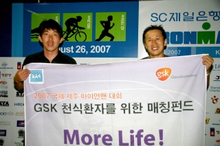 ▣세레타이드팀 직원 제주 아이언맨대회 완주 계기…1km당 5000원 매칭펀드 조성 최근 GSK 세레타이드팀이 천식환자를 위한 매칭펀드를 조성해 기부하기로 해 화제가 되고 있다. 이는 세레타이드팀 직원 2명이 최근 열린 ‘2007년 제주 국제아이언맨대회’에 참가, 완주하며 ‘철인’의 칭호를 얻은 데서 시작됐다. 이날 ‘철인’의 칭호를 얻은 세레타이드 장덕환 영업본부장과, 전북충청지역 세레타이드 영업 담당 유정암 과장이 천식 환자를 위한 뜻깊은 이벤트를 하고 싶다는 뜻을 밝히자, 회사측이 이들이 완주한 거리만큼 매칭펀드를 조성, 천식환자들을 위한 사업에 쓰기로 한 것. 제주 국제아이언맨대회는 철인3종 경기의 최고봉이라 할 수 있는 킹코스 경기로 우리나라에서는 유일하게 ‘철인’으로 공식 인정받을 수 있는 대회로, 이들은 일반적인 올림픽코스(수영 1.5km, 사이클 40km, 마라톤 10km)의 4배 이상인 수영 3.8km, 사이클 180.2km, 마라톤 42.195km 등 총 226.195km를 17시간 내에 완주하며, 철인의 칭호를 얻었다. 이에 대해 GSK는 “이번 매칭펀드는 두 직원들이 천식치료제인 세레타이드의 영업을 담당하고 있어, 이번 도전을 통해 천식환자를 위해 미약하나마 도움을 주고 싶다는 제안에서 비롯됐다”며 “이에 천식환자들의 치료를 위해 회사 차원에서 1km당 5000원의 매칭펀드를 조성, 이 기금을 한국천식알레르기협회에 기부하기로 했다”고 밝혔다. 이에 따라 1인당 113만원씩 총 226만원의 기금이 천식알레르기협회에 기부된다. |