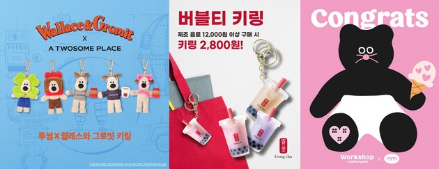 투썸플레이스는 애니메이션 시리즈 '월레스와 그로밋'과 협업한 굿즈를 한정판으로 선보였다. '투썸X월레스와 그로밋 키링'은 그로밋에게 다양한 의상을 입혀보는 '옷 입히기' 콘셉트의 인형 키링이다. 의상은 ▲축하의 의미를 담은 '스초생' ▲행운을 전하는 '네잎클로버' ▲투썸플레이스 로고가 박힌 커피잔이 함께 구성된 '네이비 후드' ▲그레이 후드 ▲리본 등 5종이다. 하나의 키링 세트에는 그로밋 키링과 의상 세트가 별도로 포장돼 있으며 서로 다른 세트에 포함된 의상도 조합해 볼 수 있는 것이 특징이다.