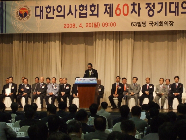 유 의장은 이어 “올해는 새로운 희망의 새 정부가 출범했다는 점에서 고무적으로 받아들이고 있으며, 더욱이 보건복지 분야 최고의 전문가가 보건복지가족부장관으로 온 것을 진심으로 환영한다”고 추켜세웠다. 유 의장은 특히 “지난 10년간의 정권에서 강행돼온 획일적 의료, 관치행정을 모두 걷어내고 국민의 건강을 책임 있게 돌볼 수 있는 한국의료의 올바른 창립이 그 어느 때 보다도 절실히 요구된다”며 “오늘 총회는 의협 2008년도 사업계획과 예산안을 확정하고 주요 정관을 개정하는 자리인 만큼 의협 창립 100주년에 걸 맞는 위상을 새롭게 만들어 가겠다는 각오로 회의에 임해 달라”고 대의원들에게 당부했다. 유 의장은 또 “점점 척박해지고 있는 의료 환경에서 의협과 전국 10만 의사의 구심적 역할을 해내기 위해선 무엇보다 효율적이고 투명한 회계 및 회무운영이 담보돼야 한다”면서 “이를 위해 10만 의사를 대표하는 여기 참석한 한분 한분의 지혜와 힘을 모아야 가능하며, 우리 의사는 오직 국민과 환자의 건강만 첫째로 생각해야 한다는 것을 다시 한 번 굳게 다짐하자”고 주문했다. |