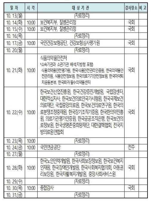 국정감사는 헌법 제61조, 국회법 제127조와 국정감사·조사법률에 따라 보건복지위원회의 소관 부처와 산하기관을 상대로 국정운영 실태를 파악하는 것은 물론 법률안 심사 등 필요한 자료를 수집, 국정 전반에 정책대안과 국정운영 방향을 제시하기 위해 실시한다.