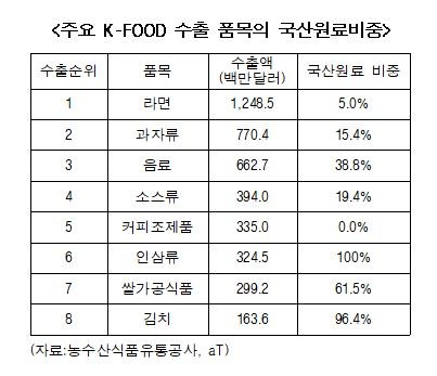 농림축산식품부가 'K-FOOD 수출 역대 최대 실적'을 홍보하고 있지만, 주요 수출품목의 국산 원료 비중은 극히 저조한 것으로 나타났다. 식품 수출산업이 국내 농업과 연계되지 못한 채 역성장하고 있다는 지적이 제기된다.