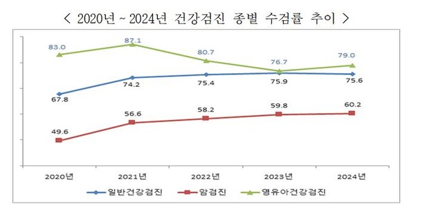 국민건강보험공단이 발간한 '2024 건강검진 통계연보'에 따르면, 2024년 일반건강검진 수검률은 75.6%로 전년 대비 0.4%p 감소했다. 암검진 수검률은 60.2%로 0.7%p 증가했고, 영유아건강검진은 79.0%로 3.0%p 상승했다. 지역별로는 세종시(80.8%)가 가장 높았고 울산(79.7%), 대전(77.4%)이 뒤를 이었다. 반면 제주(73.4%), 서울(73.8%), 경북(74.4%)은 상대적으로 낮았다. 연령별로는 50대(22.4%), 40대(20.6%), 60대(18.6%) 순으로 가장 많은 비중을 차지했다.