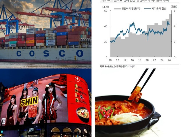 DS투자증권은 음식료 커버리지 14개 기업의 2026년 합산 실적은 매출액 68조6000억원(5% 전년동기대비), 영업이익 5조5000억원(전년동기대비 14%)으로 수익성 개선이 두드러질 것으로 전망했다. 마진이 높은 해외 실적 성장이 외형 성장을 견인하고 전년비 원가 부담 완화 및 내수 소비 기저효과 로 수익성 개선이 기대된다는 분석이다.