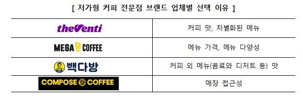더벤티는 '커피 맛'과 '차별화된 메뉴', 메가MGC커피는 '메뉴 가격'과 '메뉴 다양성', 빽다방은 '커피 외 메뉴(음료와 디저트 등)의 맛', 컴포즈커피는 '매장의 접근성'을 중요하게 생각한다는 소비자가 상대적으로 많았다.