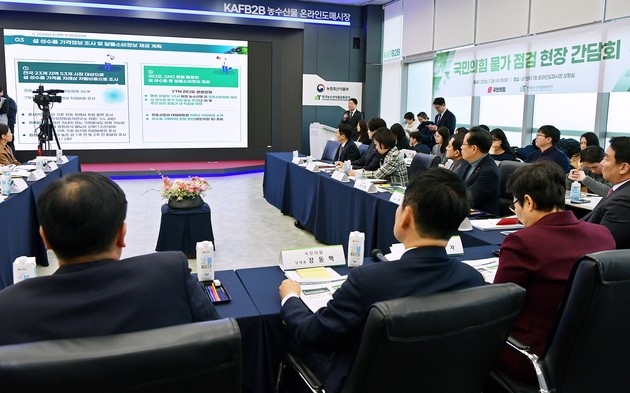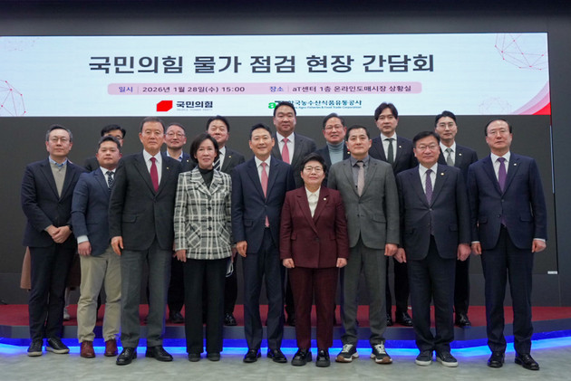 한국농수산식품유통공사(aT, 사장 홍문표)에 따르면 국민의힘(당 대표 장동혁) 지도부가 설 명절을 맞이해 28일 서울 aT센터를 방문해 안정적인 물가 관리를 위한 정책을 점검하고 농산물을 유통하는 주요업계와 간담회를 개최했다고 밝혔다.