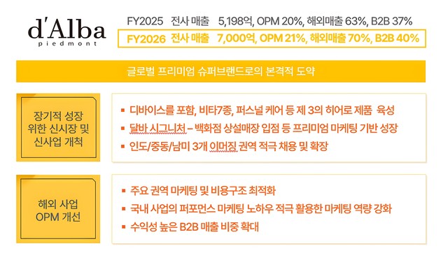 달바글로벌은 2026년 전사 매출 7000억원, 영업이익률21% 달성을 목표로 제시했다. 해외 매출 비중을 70%, B2B 비중을 40%까지 확대해 수익성과 사업 구조의 균형을 강화한다는 계획이다. 뷰티 디바이스, 비타 토닝, 퍼스널 케어 등 제3의 히어로 제품을 지속적으로 확대하고, '달바 시그니처' 강화를 통해 브랜드 경쟁력을 한층 끌어올린다는 방침이다. 이와 함께 인도·중동·남미 등 3개 신규 시장에서 현지 채용 및 사업 확장을 본격화하며 신시장 개척에 속도를 낼 예정이다.