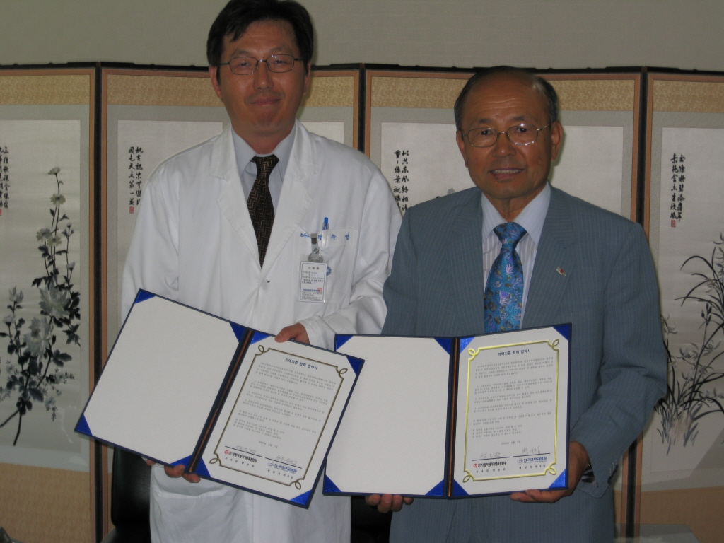 이 자리에는 본부 박진탁 본부장과 각막은행 이영훈 팀장, 단국대 박우성 병원장과 안과 장기철 교수 등이 참석했다. 협약을 통해 본부는 각막구득기관의 역할을 담당하고 단국대병원은 각막의 적출, 검사 및 이식을 담당하는 등 충청도지역에서 각막기증 요청 발생시 적출에 적극적으로 협조하기로 약속했다. 단국대학교 박우성 병원장은 “충청 지역에 각막기증자가 발생시 안과 담당자와 연계해 적극적으로 적출될 수 있도록 도울 것이며, 하루라도 빨리 각막기증이 활성화 될 수 있도록 병원차원에서 협조하겠다”고 말했다. 본부 박진탁 본부장은 “현재 우리나라는 각막이식만 하면 눈을 뜰 수 있는 시각장애인이 2만명 정도 있으나 각막기증자가 턱없이 부족해 외국 현지에서 3000불씩 수입해와 이식받는 실정”이라며 “이번 협약식을 통해 많은 시각장애인들이 새 빛을 볼 수 있길 바란다”고 밝혔다. |