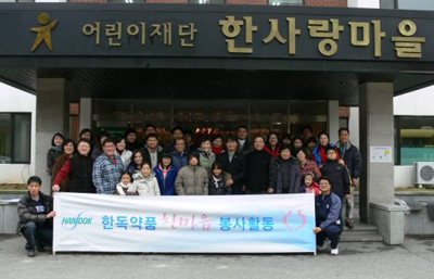 딸과 함께 참가한 한독약품 성재랑 이사는 “단순히 즐기는 송년 행사에서 벗어나 가족과 함께 하는 봉사활동을 통해 딸에게 나눔의 의미를 몸소 배우게 하고 싶었다”며 이번 봉사활동이 연말행사로서 매우 뜻 깊다고 강조했다. 한독약품 고양명 사장은 “남은 2008년을 한마음 봉사활동을 통해 나눔, 봉사, 사랑의 깊은 의미를 체험하기 위해 전직원이 발벗고 나섰다”고 활동의 의의를 설명하며 “지난 해부터 시작한 한독약품 한사랑 봉사활동을 지속적으로 전개해 나갈 것”이라고 밝혔다. 또한 한독약품은 올 한해 임직원 급여 나눔 운동을 통해 모은 300만원과 연구개발본부의 송년 바자회의 수익금 100만원을 한사랑 마을에 후원금으로 전달했다. |