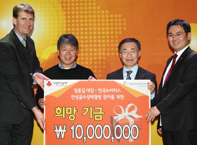 한국노바티스와 엄홍길 대장은 지난해 4월 만성골수성백혈병 환자를 위한 희망 기금 적립 체결식을 갖고 엄대장이 2008년 한해 동안 오르는 모든 산행에 대해 20m 당 1만원씩을 적립해 왔다. 지난해 초 노바티스로부터 만성골수성백혈병 및 전이성위장관기질종양 환자들을 위한 ‘희망대사’로 위촉된 엄대장은 청소년과 함께 한 스칸디나비아 지역 오지탐험 및 지난 9월 노바티스 ‘암환자를 위한 희망 등반’ 등을 포함, 총 2만여m에 달하는 산행을 기록해 1000만원의 기금을 적립하게 됐다. 이번에 전달된 만성골수성백혈병 환자를 위한 ‘희망기금’은 사랑의열매를 통해 생활 형편이 어려운 만성골수성백혈병 환자의 병원비 지원에 쓰이게 된다. 지원 대상자는 총 10명으로 사단법인 한국혈액암협회를 통해 선정, 일정 기준에 따라 심사 후 최종 결정될 예정이다. |