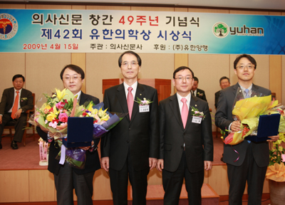 유한양행은 지난 15일 서울시의사회관에서 제42회 유한의학상 시상식을 개최했다. 이날 영예의 대상 수상자는 선정된 박덕우 교수는 스텐트 시술과 관상동맥우회술을 받은 다혈관 질환자들의 장기적인 임상경과를 비교 분석한 논문을 발표해 주목을 받았으며 논문이 해외 학술지 ‘Circulation’에 게재돼 한국의학의 우수성을 널리 알린 점이 인정받아 수상자로 선정됐다. 고원중 교수는 다제내성결핵과 광범위내성결핵 환자에게 2차 결해약제를 투여하고 적극적으로 폐절제술을 시행하면 60% 전후의 치료성공률을 80%까지 향상시킬 수 있음을 증명하는 논문을 발표해 역시 대상 수상자로 선정됐다. 논문은 해외 학술지 ‘Clinical Infectious Diseases’에 게재됐다. |