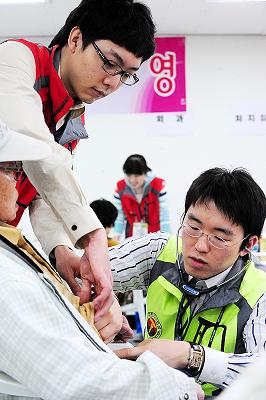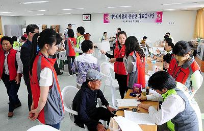 지난 2월 남양주 ‘성생농원’을 시작으로 전국 89개 정착촌을 순회하며 계속되고 있는 의협과 한빛복지협회의 한센인 무료진료 사업은 이미 다 나아서 더 이상 감염 위험이 없는 데도 불구하고 사회의 부정적인 시선 때문에 의료서비스를 제대로 받지 못하는 한센인들에게 의료혜택을 제공하고, 이들에 대한 잘못된 인식과 편견을 불식시키기 위한 취지에서 이뤄지고 있다. 두 번째 봉사활동지역인 익산농원에서는 의협이 조직한 ‘전국 한센인 의료봉사단’ 이외에도 전북의사회, 전북대병원, 원광대병원, 예수병원 등에서 의료진을 파견해 내과, 외과, 이비인후과, 가정의학과 등 한센인들에게 주로 요구되는 13개 전문과목에 대한 진료활동을 했다. 의사 27명과 간호사 7명, 약사 4명, 임상병리사 6명 등 의료진들은 물론 의대생 30여명, 간호대생 11명, 의협 직원 14명, 한빛복지협회 관계자 5명, 자원봉사자 등 총 118명이 진료에 나섰다. 익산농원 거주자들뿐만 아니라 인근 신촌농원 거주민들도 진료를 받으러 왔다. |