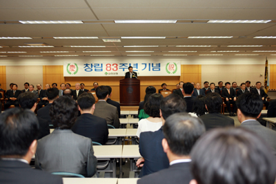 유한양행은 19일 서울 대방동 본사에서 창립 제83주년 기념식을 갖고 유한 100년사를 준비하는 시간을 가졌다. 이날 창립기념식에는 유한재단 이사장, 유한학원 이사장을 비롯한 가족회사 대표들과 유한양행 전현직 임직원들이 참석한 가운데 개최됐다. 최상후 사장은 창립기념사를 통해 “유한이 지난 83년간 수많은 위가와 역경을 극복하면서 지속적으로 성장과 발전을 해올 수 있었던 것은 있었던 것은, 유 박사님의 숭고한 창업이념과 그 뜻을 계승하기 위해 기업의 사회적 책임, 투명경영, 고객중시 경영을 성실히 수행하여 왔기 때문”이라고 평가한 후, “오늘 흘린 땀 한방울이 미래를 위한 한줌의 거름이 되고, 나아가 유한 100년사 창조의 주역이 되겠다는 책임감을 가지고 업무에 매진해 주기를 바란다”고 강조했다. 창립기념식 석상에서는 4명의 30년 근속, 22명의 20년 근속사원, 14명의 10년 근속사원 등 모두 40명의 장기근속사원에 대한 표창을 갖고 상패와 부상을 수여해 노고를 위로했다. 유한양행은 지난 1926년 고(故) 유일한 박사가 설립한 기업으로 투명한 경영과 지속적인 혁신 및 연구개발 활동으로 국내를 대표하는 제약기업으로 성장해왔다. |