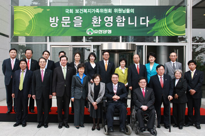 이는 국정감사 일정의 일환으로, 우수 신약 개발 연구시설을 방문해 연구 성과와 현황 등을 시찰하기 위해 이뤄졌다. 이날 시찰에는 변웅전 위원장을 비롯한 복지위 소속 의원들이 참석했고 유한양행 김윤섭 사장, 이태오 중앙연구소장 등이 배석했다. 시찰을 통해 소속 의원들은 유한양행의 신약 연구개발 현황, 연구 장면 및 시설 등을 직접 확인했으며, 간담회를 갖고 국내 제약 및 바이오 산업에 대한 제안 등을 청취했다. 이 자리에서 유한양행 김윤섭 사장은 국내 제약업계의 연구개발 성과 및 미래전망 등을 설명하고, “미래 성장동력의 될 신약 개발, 특히 그 주역인 제약산업이 성장동력을 잃지 않도록 제도적 지원에 관심을 가져달라”는 의견을 피력했다. 또한 참석 의원들은 신약 개발 등을 위한 정부 지원금의 규모 및 현실성, 혁신적 신약 개발을 위한 국가적 차원의 지원 필요성, 임상 등 개발단계별 인프라 구축을 위한 정책적 과제 등에 질의를 쏟아내는 등 제약산업 발전 및 세계적 신약 개발을 둘러싼 환경에 큰 관심을 나타냈다. 경기 용인시에 위치한 유한양행 중앙연구소는 지난 2005년 12월 1일 공식 준공한 국내 제약업계 최대규모이자 시설면에서도 최첨단 연구소로 연구동과 GLP 시설 및 원료의약품 양산을 위한 소규모 생산시설인 kg-Lab동까지 갖추고 있어 국제적인 수준의 연구개발 인프라를 갖추었으며 200명에 가까운 연구 인력이 연구 개발에 매진하고 있다. |