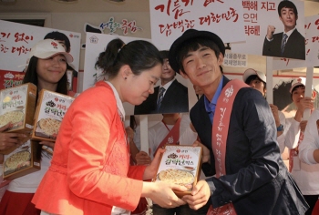 한민관은 ‘기름기 없는 대한민국을 위하여’라는 구호를 외치며 실제 지방 선거와 똑같이 피켓과 어깨띠를 두르고 선거 지지 연설, 제품 홍보송 등을 선보이고 행사에 참여한 고객들에게 사인과 함께 제품을 증정했다. 한민관은 오는 6월까지 ‘선거 패러디 마케팅’이라는 특이한 컨셉트를 갖고 진행되는 ‘큐원 갈릭난 믹스 론칭 캠페인’을 통해 소비자들과 직접 만나게 될 예정이다. |