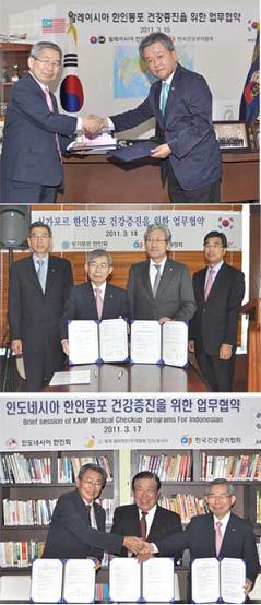 싱가포르 한인회, 한나프레스신문사와 함께하는 업무협약은 박기출 한인회장과 이건기 한나프레스신문 발행인, 오준 주싱가포르 대한민국 대사, 조한익 건협 회장, 조재현 광주전남지부 본부장 등이 참석한 가운데 지난 14일 싱가포르 타워클럽에서 이뤄졌다. 이번 협약으로 건협은 전국 건강검진센터에서 한인회원 및 가족들, 신문사 임직원·가족에게 건강검진 우대서비스 제공은 물론 이메일을 이용한 건진 결과 제공, 유소견자를 대상으로 한 협약기관과 치료연계를 실시하고, 싱가포르 한인회원이 추천하는 한인동포 및 원주민에게도 동일한 혜택을 제공하게 된다. 말레이시아 한인회와의 업무협약은 이광선 말레이시아 한인회장, 조한익 건협 회장, 조재현 광주전남지부 본부장 등이 참석한 가운데 지난 15일 한인회 사무실에서 이뤄졌다. 인도네시아 한인회와의 업무협약은 승은호 인도네시아 한인회장, 최동묵 세계해외한인무역협회 인도네시아 회장, 조한익 건협 회장, 조재현 광주전남지부 본부장 등이 참석한 가운데 지난 17일 한인회 사무실에서 체결됐다. 특히 인도네시아에서는 한인회 뿐 아니라 세계해외한인무역협회(OKTA) 인도네시아지회와도 동일한 협약을 체결해 건협은 한인회원과 가족들, OKTA 회원들에게도 싱가포르 한인회와 동일한 건강증진서비스를 제공하게 된다. 조한익 회장은 “주치의처럼 교민들의 건강관리를 위해 최선의 노력을 다할 것이며, 건강하신 분들에게는 예방차원의 건강관리를, 질병이 있으신 분께는 협약의료기관과의 치료 연계를 통한 철저한 사후관리로 교민들의 건강관리에 만전을 다하겠다”고 말했다. 조 회장은 “싱가포르 2만, 말레이시아 3만, 인도네시아 7만명의 회원을 갖고 있는 한인회, 그리고 이들에게 홍보를 담당하고 있는 한나프레스신문사와의 이번 업무협약으로 건협은 한인동포에 대한 건강증진에 기여함은 물론 동남아지역 의료관광 해외시장의 교두보가 될 것으로 기대된다”고 밝혔다. |