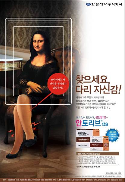 37년 전통의 제약회사 한림제약은 최근 출시한 다리 부종 개선 일반의약품 ‘안토리브’ 광고에 색다른 이미지를 사용했다. 바로 전 세계인들이 가장 사랑하는 미술작품인 ‘모나리자’다. ‘모나리자’는 르네상스 시대의 대화가 레오나르도 다 빈치가 피렌체의 부호 프란체스코 델 조콘다의 부인을 위해 그린 초상화이다. 그림 속 여성의 미소가 보는 사람으로 하여금 신비감을 느끼게 해 ‘모나리자의 수수께끼’로 지금까지도 많은 관심을 받고 있는 작품이다. 하지만 이번 안토리브 광고에서는 독특하게 모나리자의 ‘미소’가 아닌 ‘다리’에 이야기의 초점을 맞췄다. 실제 초상화에 없는 하반신을 소재로 “모나리자는 왜 전신을 공개하지 않았을까?”라는 재미있는 화두를 던진 것이다. 의자에 앉아 온화한 미소를 띄고 있는 모나리자의 상반신 사진에 부기와 통증으로 두꺼워진 여성의 다리 사진을 가상으로 합성해 보여주면서 ‘과연 모나리자의 각선미는 아름다운 미소만큼 아름답고 건강했을까?’라는 발칙하고 재미있는 상상을 하게 해준다. 실제로 여성들은 오랜 시간 고정된 자세로 앉거나 서서 하루를 보내면서 다리 정맥 내 혈액 순환이 제대로 이루어지지 않아 다리가 붓고 통증이 발생하는 일이 빈번하다. 안토리브의 이번 광고는 바로 그러한 여성들의 생활적인 공감대를 이끌어내기 위한 광고이다. 바쁜 일상 속에 자칫 다리 건강을 챙기기 힘든 여성들을 위해 약국에서 간편하게 구입해 다리 부기와 통증을 개선하고 하지정맥류를 예방할 수 있는 안토리브의 효능과 장점을 표현해냈다. 한편으로는 요즘 광고와 다른 고전적이고 평이한 느낌을 주기도하지만 귀부인 모나리자의 품격 있는 이미지와 브라운 계열의 안정적인 색감이 오히려 제품에 대한 안정감과 약효에 대한 신뢰감을 제대로 표현해 냈다는 것이 일반적인 평가다. 박순용 안토리브 담당PM은 “이번 모나리자 패러디 광고를 통해 여성들의 다리 건강과 미용에 대한 공감대를 더욱 끌어내고 약국에서의 실질적인 인지도 확산을 기대하고 있다”고 하며 “향후 지면 광고뿐 아니라 TV와 라디오 등 타깃 대상을 고려한 다양하고 획기적인 광고로 안토리브를 알려나갈 계획이다”라고 말했다. |