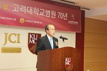 고려대학교병원(원장 김창덕)이 1일 개원 70주년을 맞아 1일 대회의실에서 기념행사를 진행했다. 이날 행사에는 고려대학교 강선보 교무부총장, 김문석 세종부총장, 손창성 의무부총장, 서성옥 의과대학장, 김창덕 병원장을 비롯한 김세경 전 고려대학교병원장, 이기찬 전 의무부총장 등 원로교수 및 고려대학교병원 교직원 등 300여명이 참석했다. 김창덕 병원장은 기념사를 통해 "신성장동력 창출을 통한 무한경쟁 의료시장에서 최정상급 의료기관으로 도약하기 위해 첨단의학센터 건립에 임박해 있다"며 "고대병원이 자랑하는 국제적수준의 특성화센터를 집중 양성해 해외의료사업을 적극 추진하는 한편 최첨단 연구 및 진료를 위한 장비확충도 과감히 진행해야 할 것"이라고 강조했다. 강선보 교무부총장은 "JCI 인증을 비롯해 최첨단 의술과 세계적인 연구역량으로 국내 의료계의 선구자적 역할을 담당하고 있는 고려대학교병원은 미래지향적인 의료기관을 기치로 고려대의료원 전체가 국제적인 의료기관으로 재도약할 수 있는 힘찬 엔진으로써의 역할을 다해줄 것으로 확신한다”라며 고대 김병철 총장의 축사를 대독했다. 손창성 의무부총장은 "개원 70년이 되는 오늘의 이정표 하나가 우리의 역사가 되고 우리의 미래가 되는 만큼 앞으로도 변함없는 믿음과 열정으로 의료인이자 의료기관 종사자로 주어진 소명을 성실히 수행해 고려대학교의료원의 자랑이 되어주시길 부탁한다"고 말했다. 한편 행사는 △ 1부 학술심포지움 △ 2부 기념식 △ 3부 만찬 등 총 3부로 나뉘어 진행됐으며, 1부 학술심포지움에서는 ‘고대병원의 지난 70년’(김형규 교수), 고대병원의 주요 연구현황(이민수 ? 인광호 교수), ‘고대병원의 발전방향(선경 교수 김철중 기자)등 3가지 연제가 발표됐다. |