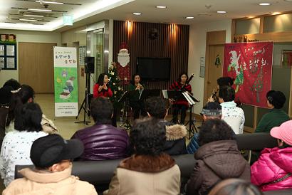 사이버나이프수술과 방사선 치료를 받고 있는 환자들의 따뜻한 연말을 위해 마련한 음악회는 오보에, 바순, 플롯, 클라리넷, 호른 등 목관 5중주의 협연으로 진행했다. 바움 실내악단은 크리스마스 캐롤 메들리, 마법의 성, 호두까기 인형 등의 음악 연주를 통해 추운 겨울 환자들의 마음을 녹여 주었다. 한편 연주를 관람한 환자들은 “실력 있는 연주자들의 협연이 깊은 인상을 주었다”며 “병원에서 음악연주를 관람하기 쉽지 않은데 바로 앞에서 볼 수 있어 좋았다”고 말했다. |
