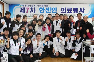 이번 의료봉사는 신암농원 거주자 외에 인근 비룡농원, 신흥농원 등 100여명의 한센인들을 대상으로 251건의 진료활동을 펼쳤으며 추운 날씨 속에서도 의료진과 자원봉사자 모두 적극적으로 참여하여 한센인 어르신들에게 뜻 깊은 의료서비스를 제공하였다. 의협과 한빛복지협회의 한센인 정착촌 의료봉사 사업은 지난 2009년 2월 제1차 경기 남양주의‘성생농원’을 시작으로 2011년 10월 제6차 전남 나주 ‘호혜농원’까지 약 1,000여명의 한센인을 대상으로 의료봉사를 실시해 오고 있다. 한센인 의료봉사는 전국 89곳의 한센인 정착촌을 순회하며 의료봉사활동을 실시하고 있으며, 사회의 부정적인 편견 때문에 의료혜택을 제대로 받지 못하는 고령의 한센인들에게 의료서비스를 제공할 뿐만 아니라 마음의 상처까지 치유될 수 있도록 따뜻한 사랑의 손길을 전하고 있다. 이번 봉사활동에는 의협 사회협력단 이외에도 전라북도의사회, 김제시의사회, 원광대학교병원, 의사시니어직능클럽, 김제시약사회 등이 동참하였으며, 내과, 외과, 신경정신과, 이비인후과, 안과, 피부과, 재활의학과 등 전문과목별로 진료활동을 펼쳐 한센인 어르신들의 건강을 살폈다. 의사 8명과 간호사 2명, 약사 2명, 간호조무사 3명, 물리치료사 1명 등 의료진들을 비롯해 의대․의전원 학생 10명, 의협 직원, 한빛복지협회 관계자, 원광대병원 관계자 등 총 40여명이 참여했다. |