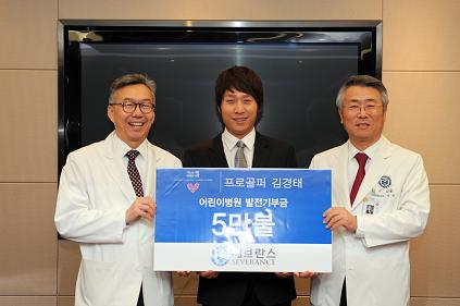 프로골퍼 김경태 선수가 27일 세브란스 어린이병원에 5만 달러(약 5800만원)를 기부했다. 김경태 선수는 올해 26세의 나이로 한국과 일본 골프투어를 석권하고 내년 미국 PGA 무대 진출을 준비하고 있는 한국 골프계의 스타다. 김경태 선수는 연세의료원장실에서 진행된 기부금 전달식에서 “2011년은 개인적으로 최고의 해가 아니었나 생각한다"며 "이는 제 성적에 함께 기뻐해 주시고 격려해 주시는 국민 여러분들의 성원 덕분이며, 여러 분들께 조금이라도 보답하기 위해 어린이 환자들을 위한 기부를 생각하게 됐다”고 기부의 뜻을 밝혔다. 세계 25위인 김경태는 지난 해 일본 상금왕을 차지했고, 올해 5개 대회만 나서고도 한국 상금왕 자리에 올랐다. 최근 열린 프레지던츠컵에서는 올해 PGA 상금 2위인 세계 10위 심슨과의 맞대결에서 승리를 거두는 등 상승세를 이어가고 있다. |