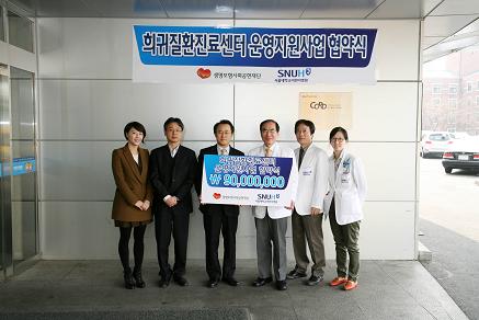 서울대학교어린이병원(원장 노정일)은 최근 생명보험사회공헌재단과 “희귀질환진료센터 지원 협약식”을 갖고 병원 내 희귀질환진료센터 지원 사업을 위한 상호협력을 약속했다. 이번 협약을 통해 생명보험사회공헌재단은 9천만원의 지원금을 센터에 전달했다. 지원금은 가정 형편이 어려운 희귀난치성 환자의 진료와 진단검사에 쓰일 예정이다. 생명보험사회공헌재단 정봉은 상무는 “이번 협약을 통해 정부·사회적 지원이 취약한 차상위계층 이하의 희귀난치성 환아 및 가족들의 삶의 질 향상에 크게 기여하기를 기대한다”고 말했다. |