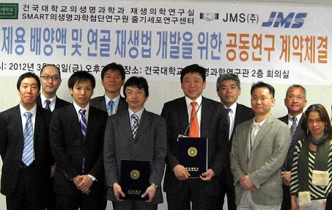 이번 협약에 따라 건국대 SMART의생명과학첨단연구원 산하 줄기세포연구센터는 일본의 의료기구 및 의약품 제조 기업인 JMS의 히로시마 중앙연구소와 3년간 ‘세포치료제용 배양액 및 신규 연골 재생법’에 관한 연구개발을 공동으로 수행하게 된다. 수액라인과 수액백 등 의료기구와 의약품 제조 회사인 (주)JMS(1965년 설립)는 도쿄와 히로시마에 본사 및 중앙연구소를 설치해 수액수혈분야, 인공심폐분야, 재생의료를 포함하는 첨단 의료 분야를 중심으로 연구개발을 하고 있다. JMS는 건국대 줄기세포교실 이정익 교수 연구팀에 앞으로 3년간 300만엔의 연구비를 지원하며, 두 기관은 세포치료제 세포 배양용 배양액 개발과 신규 연골 재생법 개발을 위한 공동연구를 하게 된다. |