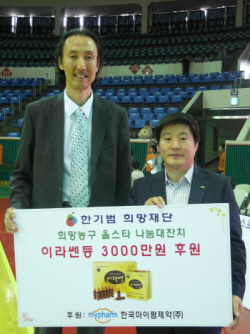 이 행사는 ‘심장병 어린이’, ‘다문화 가정’ 그리고 ‘농구 꿈나무’들을 위해 한기범 희망재단에서 매년 개최하는 행사다. 이번 대회는 서울특별시교육청과 희망농구올스타조직위원회가 주최하고, 한기범 희망재단이 주관한 행사로서, 김승현, 김주성, 주희정 등 국가대표농구선수가 총 출동했으며, 허재, 강동희, 한기범, 박찬숙 등 왕년의 스타선수 등 남녀 올스타의 혼성경기가 국내 최초로 열렸다. 허준영 회장은 인사말을 통해 “회사 창립 이래 십 수년 동안을 한결같이, 올림픽, 월드컵, WBC 등 매년 열리는 각종 스포츠 국제대회 때마다 청소년에게 꿈을 주고 국민들에게 감동을 주는 국가대표팀과 대표선수들에게 후원을 계속해오고 있다” 면서 “이번 ‘희망농구 올스타 나눔 대잔치’는 스포츠를 통해 학생들에게는 자신감을, 심장병 환우들에게는 새생명을, 농구 꿈나무에게는 희망을 주고자 마련됐다”며 후원을 하게 된 배경을 설명했다. |
