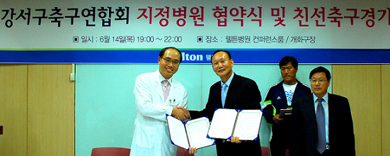강서구 생활체육 축구 연합회는 1979년 지역민들의 건강 증진 및 여가활동 활성화를 위해 설립됐으며, 현재 3000명의 회원들이 소속돼 활동하고 있다. 웰튼병원 컨퍼런스룸에서 진행된 협약식에는 송상호 원장을 비롯해 강서구 생활체육 축구 연합회 이명재 회장, 김화만 고문 등 총 50여명이 참석했다. 협약식에서 웰튼병원은 강서구 축구연합회 측에 구급함 등을 전달하고 건강 검진 및 진료, 응급조치 등에 대한 의료 서비스 지원을 약속했다. 웰튼병원은 정기적인 관절 검진을 지원하고 시합 중 발생한 관절 부상에 대한 치료와 재활을 돕게 된다. 또한 관절염 예방을 위한 교육 등도 계획돼 있다. 송상호 원장은 “이번 협약은 지역 사회 건강 증진 및 스포츠 활동 활성화에 일조할 수 있을 것으로 기대된다”며 “스포츠 부상 중 가장 흔하게 나타나는 것이 축구로 인한 무릎 부상이라는 점에서 부상에 대한 체계적인 지원 활동을 통해 지역 ‘건강’ 지킴이로서의 역할을 충실히 수행해 나갈 것”이라고 말했다. 한편, 웰튼병원은 지난해 강서실버축구단과 지정 병원 협약을 체결하고 현재까지 다양한 의료 서비스를 지원하고 있으며, 강서 소방대원 및 직계가족을 대상으로 무료 관절 검진을 실시하기도 했다. |