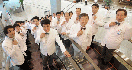 관동의대 명지병원(병원장 김세철)은 병원 내 ‘감염 제로’ 실현을 위한 ‘Clean & Safe’ 운동의 일환으로 최근 전체 교수가 나비넥타이를 착용하는 ‘버터플라이 프로젝트’를 시작했다. ‘버터플라이 프로젝트’는 교수직을 비롯한 전공의, 간호사, 의료기능직, 행정직 등 전 직종에 걸쳐 ‘감염예방과 환자존중’을 상징하는 새로운 ‘드레스코드’(Dress Cord)를 일제히 적용한 것이다. 특히 교수 전체가 병원감염의 주 요인으로 지적돼 온 긴 가운과 넥타이를 과감히 벗어던졌다. 대신 기존 보다 40cm 이상 길이가 짧아진 양복형태의 심플한 재킷 가운과 나이넥타이(보타이)를 착용하고 진료에 나섰다. 기존에도 짧은 가운을 입는 병원과 일부 또는 권고사항정도로 보타이를 매는 병원이 몇몇 있기는 했지만, 전체 교수가 보타이를 의무적으로 매는 드레스코드를 실시하는 것은 명지병원이 처음이다. 김세철 병원장은 “보타이는 환자에 대한 정중함과 친근감을 동시에 전달할 수 있는 외형적 장점을 지니고 있으면서도 감염의 위험으로부터 자유로울 수 있다는 점에서 ‘환자제일주의’를 가장 잘 나타내주는 상징”이라고 말했다. 한국의료QA학회 회장직을 맡고 있는 김 병원장은 교수들의 보타이 드레스 코드 적용을 위해 긴 가운과 넥타이의 감염 위험을 지적하는 연구논문을 일일이 찾아 제시하며 교수들을 설득한 것으로 알려졌다. 결국 고참 교수들이 많은 임상과장회의에서의 격론 끝에 보타이 착용을 전체교수회의에 회부키로 했으며, 전체교수회의 전격적인 합의로 ‘드레스 코드’를 확정했다. |