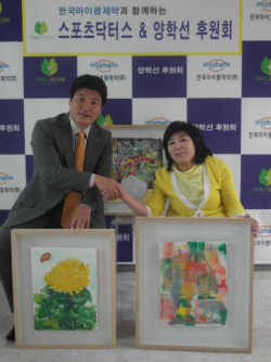 데미킴은 척추장애를 딛고 희망을 그리는 화가로 미국, 독일, 스위스, 네덜란드 등에서 미술을 전공하고, 국제적인 화가로서의 꿈을 이뤘다. 미술을 통한 심리치료와 한미척추장애인재단을 설립해 같은 아픔을 겪고 있는 자들에게 꿈과 희망을 전하고 있다. 한국마이팜제약과 함께 하는 스포츠닥터스는 의사들(회장 최광호, 초이스피부과)이 모여서 스포츠 스타들(회장 황영조), 연예계 스타들(회장 정준호)과 함께 ‘꿈이 있는 자에겐 희망을, 소외된 자에겐 나눔을’ 실천하고자, 국내외 의료봉사활동과 스포츠꿈나무들을 후원하기 위해 설립됐다. |