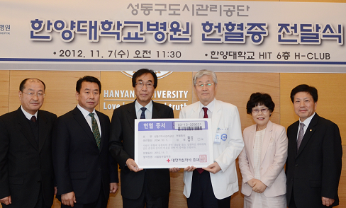 | 한양대학교병원(병원장 이춘용)은 성동구도시관리공단과 지난 7일 한양대학교 HIT 6층에서 헌혈증 전달식을 진행했다. | ||