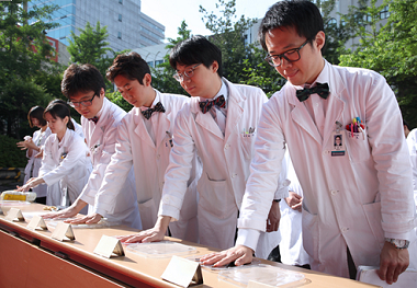 환자 안전사고와 감염발생률 제로를 목표로한 이번 행사에서는 의료진 가운과 넥타이에서 발생하는 감염을 최소화하기 위해 보타이(나비넥타이) 착용과 짧은 재킷가운으로 교체하는 시간을 마련했다. 또 환자들과 자주 접촉이 있는 내과계, 외과계, 비뇨기과 등 전공의 대표 13명을 선발해 착용하고 있는 긴 넥타이를 가위로 자르고 나비넥타이를 착용하는 퍼포먼스도 선보였다. 이어 환자안전관리위원장 장여구 교수와 감염관리위원회 부위원장 황동희 교수가 환자안전문화 구축의 실천 사항이 담긴 헌정낭독을 통해 모든 환자에게 최상의 의료 환경을 제공할 의무와 책임이 있음을 다시한번 강조했다. 이날 의료진과 교직원 300여명은 핸드 플레이트에 손도장을 찍어 손으로부터 전해지는 오염을 확인하고 점검해 보는 시간도 가졌다. 이 결과는 감염예방의 경감심을 일깨우기 위해 세균배양을 통해 일주일 후 발표할 예정이다. 최석구 원장은 "환자 안전과 감염은 아무리 강조해도 지나치지 않는다"며 "요즘 야생진드기 바이러스와 코로나바이러스 같은 감염사례가 늘고 있어 이번 계기로 의료진은 위생에 더욱 신경써 주기를 바란다"고 전했다. 감염관리위원회에서는 특강으로 분당서울대병원 감염내과 김의석 교수를 초청해 '환자안전과 감염예방'에 관한 강의도 마련했다. |