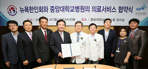 협약식은 지난 24일 중앙대병원 중앙관 5층 회의실에서 중앙대병원 김성덕 원장과 김경도 부원장, 김의정 관리실장, 뉴욕한인회 민승기 회장, 김영진 뉴욕직능단체 의장, 신재환 차석부회장 등 양 기관 주요 인사가 참석한 가운데 열렸으며, 우의와 협력을 바탕으로 유대를 강화하고 상호발전을 도모하는데 뜻을 같이 했다. 이번 협약에 따라 중앙대병원은 뉴욕한인회 회원의 병원 내원시 1:1 에스코트 및 개인 맞춤형 서비스를 제공하는 등 뉴욕한인회 회원들의 건강증진을 위해 노력할 계획이다. 중앙대병원은 이번 협약 체결에 앞서 지난해 뉴욕한인경제인협회, 뉴욕한인직능단체협의회, 뉴욕한인건설협회 등 뉴욕 한인사회 단체들과 의료서비스 협약을 체결한 바 있으며, 미동부 추석대잔치에 참여해 재미동포를 대상으로 무료 검진 행사를 개최하는 등 미국내 한인사회와의 교류를 지속적으로 확대해 나가고 있다. |