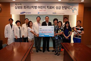 이날 전달식에는 심사평가원 강윤구 원장, 삼성서울병원 송재훈 병원장, 한국사회복지협의회 모옥희 부장 등과 환자 강○○양(여 12세), 권○○군(남 4세), 김○○양(남 1세), 전○○군(남 5세), 홍○○양(남 1세), T○○양(여 4) 보호자가 참석했다. 이번 캠페인은 38회 차로 2004년부터 현재까지 총 178명의 환우에게 11억 5000여만원을 후원금으로 전달했다. 심사평가원은 올해 희귀난치질환으로 고통받고 있는 환아 및 가족들을 위해 찾아가는 작은 음악회, 환아 투병․간병 수기 공모전 등 정서적 지원 프로그램 다양화를 통해 희귀난치병 어린이 돕기 프로젝트를 지속적으로 이어나가 공공기관으로서 사회적 책임을 적극적으로 실천할 계획이다. |
