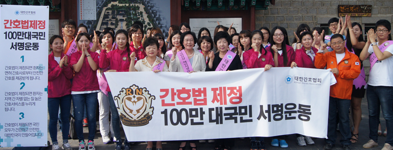 이번 대장정을 통해 간협은 국민들 곁으로 찾아가는 간호봉사활동을 펼치면서, 간호법 제정의 취지를 설명하고 지지 서명을 받을 계획이다. 특히 협회 중앙봉사단과 전국 시도간호사회가 협력해 전국을 순회하며 간호법 제정 100만 서명운동을 펼칠 예정이다. 릴레이 서명운동의 결과는 오는 10월 24일 열리는 간협 창립 90주년 기념행사에서 보고할 계획이다. 간협은 지난 20일 전국대장정 첫 방문지인 전북 전주와 완주를 찾아 전북간호사회 소속 50여명의 일일봉사대원들과 함께 하루 일정을 알차게 수행했다. 이날 협회 중앙봉사단과 전북간호사회 일일봉사단은 전북 전주시 완산구 풍남동 경기전 앞에서 간호법 제정을 위한 100만 서명운동 발대식을 갖고 법 제정이 이뤄지는 그날까지 국민들의 참여를 이끌어내기 위해 최선을 다할 것을 다짐했다. 성명숙 회장은 “이번 전국대장정을 통해 국민 모두가 간호사로부터 보다 나은 간호서비스를 제공받을 수 있도록 우리 모두 힘을 모아 간호법 제정을 앞당기자”고 간호사와 간호학생들에게 당부했다. 발대식이 끝난 뒤 전북간호사회 일일봉사단은 ‘국민건강 간호사가 책임집니다’라고 새겨진 어깨띠와 ‘간호법 제정을 위한 대국민 서명운동’이라고 적힌 핸드용 작은 현수막을 들고 경기전 일대 시민들을 찾아 시민홍보용 리플릿을 나눠주며 게릴라식 캠페인을 벌이며 시민들의 이목을 집중시켰으며, 간호법 제정의 필요성에 대해 설명하고 서명을 직접 받는 등 다양한 활동을 펼쳤다. 또 전북대병원, 원광대병원, 예수병원 간호사들이 참여한 가운데 시민들을 대상으로 혈당과 혈압을 측정해주고 건강상담을 진행했다. 중앙봉사단은 전북 완주군 용진면 운곡리를 찾아 몸이 불편한 어르신들에게 조금이라도 도움을 주기 위해 빨래봉사를 실시하기도 했으며, 간협은 독거어르신들을 위해 한국제약협회 후원을 받아 준비해간 500만원 상당의 가정상비약품을 운곡보건진료소에 전달했다. |