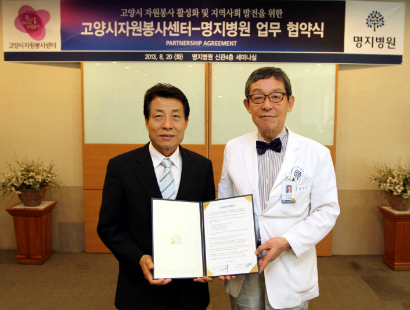 ‘명지병원-고양시자원봉사센터’간의 업무 협약은 지역 자원봉사활동 활성화에 상호 협력하기로 한 것이다. 이 협약에 따라 명지병원은 고양시자원봉사센터에 등록돼 활동하는 자원봉사자들을 대상으로 건강검진을 비롯한 진료혜택과 편의를 제공키로 했으며, 자원봉사 마일리지제에 따른 보상프로그램에도 적극 협력키로 했다. 고양시자원봉사센터는 명지병원과 실무네트워크를 구축, 고양시 등록 자원봉사자들의 명지병원 봉사활동 등을 지원하게 된다. 김세철 병원장은 “자원봉사자들로부터 큰 도움을 받고 있는 명지병원으로서는 자원봉사자들의 역할의 중요성에 대해 익히 잘 알고 있다”며 “12만여 고양시 자원봉사자들의 수고에 조금이나마 힘이 될 수 있도록 건강지킴이로서의 역할을 잘 수행할 수 있도록 노력하겠다”고 말했다. |
