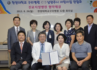 이날 행사에는 한양대학교구리병원 김경헌 원장, 김종래 운영지원국장, 윤영선 간호국장, 정창순 남양주시 어린이집 연합회장 등 주요 보직자가 참석한 가운데 진행됐다. 김경헌 병원장은 인사말에서 “남양주시는 지속적인 노력을 통해 비약적인 발전과 많은 인구수 증가를 이뤄낸 도시이다”며 “구리, 남양주 지역의 유일한 대학병원인 한양대구리병원이 지역 건강지킴이로써 남양주시 어린이집 아이들의 보건향상을 위해 적극적으로 노력하겠다”고 말했다. 정창순 연합회장은 인사말에서 “남양주시 어린이집 연합회는 700여 개의 어린이집이 속해 있는 대규모 연합회이다”며 “한양대구리병원이 밝고 씩씩한 어린이들의 든든한 건강지킴이가 되어 지역 의료의 중심적인 역할을 해 주길 바란다”고 말했다. 이번 지정병원 협약식을 통해 한양대학교구리병원은 어린이집 내에 응급상황 발생 시 조기에 진료할 수있도록 적극적으로 지원하여 어린이집 아이들의 보건향상 및 상호발전을 위해 협력하기로 했다. |