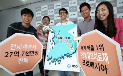 이번 행사는 탈모치료제 프로페시아의 글로벌 발매 15주년을 자축하며, 출시 이후부터 2012년까지 전 세계에서 판매된 프로페시아 누적 판매량을 발표하는 등 프로페시아의 성과를 돌아보기 위해 마련됐다. 이를 기념해 임직원들과 함께 프로페시아 알약 모양의 보드판에 발매 15주년 축하 혹은 응원 메시지 등을 적어 프로페시아 전 세계 판매량을 나타내는 대형 지도에 장식하는 시간을 가졌다. 프로페시아는 세계 매출 1위 남성형 탈모치료제로 지난 1998년 미국에서 탈모치료제로 시판된 이후 약 15년 간 전 세계 50개 이상의 국가에서 약 27억7000만정이 판매, 지름 약 0.7cm 팔각형 모양의 프로페시아 알약을 일렬로 쭉 세웠을 때 이를 거리로 환산해 보면 1만9390km로 이는 서울과 부산을 약 23회 왕복할 수 있는 규모이다. 한편 국내에서는 약 1억2000만정이 판매됐다. 이렇듯 프로페시아는 한국을 포함해 전 세계 수 백만명 환자들이 복용한 대표적인 남성형 탈모치료제이다. 한국 MSD 김민정 본부장은 “프로페시아는 출시 이후 지난 15년간 남성형 탈모의 의학적 치료에 대한 새로운 패러다임을 제시하기 위해 노력해왔다”며 “앞으로도 프로페시아는 탈모치료제 시장을 이끄는 리딩 브랜드로 탈모로 고민하고 있는 많은 남성들이 안전성 프로파일과 효능이 검증된 의학적 치료를 통해 성공적인 탈모치료를 받을 수 있도록 최선을 다할 것이다”라고 말했다. |