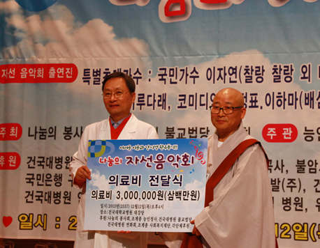 건국대병원 불교법당 능인정사는 지난 12일 원내 대강당에서 소외된 이웃과 난치병 환우를 돕기 위한 제6회 ‘나눔의 음악회’를 열었다. 능인정사는 행사를 통해 모금한 기금 300만원을 건국대병원에 전달하고, 광진구 저소득 주민 300명에게 쌀 300포대를 지원했다. 불교법당의 법경스님은 “이번 음악회가 이웃에게 따뜻함을 나눌 수 있는 자리가 됐으면 좋겠다”고 말했다. 한설희 병원장은 “좋은 자리를 마련해주신 법경스님께 감사하다”며 “모두가 따뜻하고 평안한 연말이 되길 바란다”고 말했다. 올해로 6회를 맞은 음악회에는 가수 이자연, 박정식 씨를 비롯해 불자가수 머루다래, 코미디언 이정표 씨 등이 공연을 펼쳤다. 이번 행사에는 대한불교조계종 직지사 전 주지 자광큰스님, 양정현 건국대병원 의료원장, 한설희 건국대병원 병원장, 임춘식 광진구청 복지국장을 비롯해 총 700여명이 참석했다. 능인정사는 지난 1988년부터 30년 가까이 광진구 지역 복지시설과 형편이 어려운 이웃들을 위해 봉사활동을 하고 있다. |