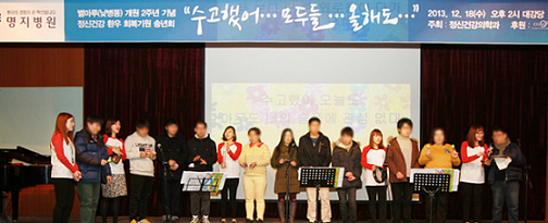 별마루는 대인관계와 사회 적응에 어려움이 있는 환우들의 사회복귀를 돕는 명지병원 통원치료 병동으로, 이번 행사처럼 관련 질환에 대한 인식 개선과 가족 등의 인권 증진 활동도 함께 하고 있다. '수고했어 모두들, 올해도'라는 주제로 열린 이날 행사는 별마루 환우들과 담당 의료진, 간호사, 음악치료사 등이 함께 참여하는 형식으로 진행됐다. 별마루 환우들은 이날 '너는 특별하단다'라는 음악극을 직접 발표하고 회복 과정을 담은 글과 자작시를 낭송하며 크리스마스 캐롤 등의 합창도 선보였다. 이어 정신건강의학과 의국, 간호팀, 외래, 치료사 등으로 구성된 의료팀이 '괜찮습니다'라는 노래와 율동으로 화답하며 마무리됐다. 정신건강의학과 김현수 교수는 "별마루가 문을 연 지난 2년간 수많은 별마루 환우들이 통원 치료를 통해 성공적으로 사회에 복귀했다"며 "이번 행사를 통해 현재 치료중인 환우들의 재활 의지를 북돋고 보호자들에게도 용기와 위로를 전해주고자 했다"고 말했다. 이날 행사장에서는 별마루 환우들이 직접 작업한 미술 작품이 전시됐으며 이들이 만든 소품 판매도 이뤄졌다. 수익금은 명지병원 사회사업을 위한 사랑나눔기금으로 기부될 예정이다. 명지병원은 지난 2010년 호텔 로비처럼 고급스러운 홀에 소파 등을 배치하고 세련된 인테리어의 치료실, 면담실, 헬스 공간 등과 안전 시설을 갖춘 새로운 개념의 정신과 병동 '해마루'를 개소하고 환자와 가족들에게 양질의 통합 의료서비스를 선보인 바 있다. 이후 통원 치료가 가능한 낮 병원인 별마루 프로그램을 운영하며 집중적인 정신사회재활치료를 제공하고 있다. |