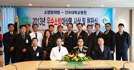 우수소방대상물 평가기준은 안전관리 분야 37개 항목, 소방시설 유지관리 분야 21개 항목, 안전경영시스템 분야 19개 항목이다. 이번 선정으로 건국대병원은 소방시설 종합정밀점검을 2년간 면제받게 됐다. 한설희 병원장은 “앞으로도 시설안전관리와 소방안전교육을 철저히 시행 하겠다”며 “우수소방대상물로 선정 된 만큼 앞으로도 책임감을 갖고 지속적인 노력을 기울이겠다”고 말했다. 이날 시상식에는 광진소방서 김위환 소방서장, 문정명 예방과장, 김남주 검사지도팀장 등 광진소방서 관계자 9명, 건국대병원 한설희 병원장, 채종오 행정처장, 박영림 간호부장, 최덕훈 건축시설팀장 등 병원관계자 9명이 참석했다. |