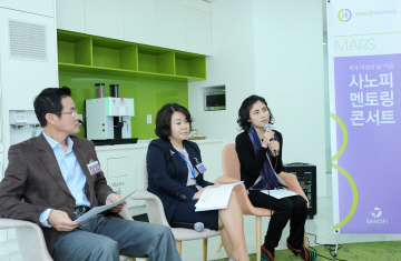 ‘어떤 배우자와 결혼해야 하는가?–행복한 나의 삶과 일을 위하여’를 주제로 열린 이번 사노피 멘토링 콘서트는 사노피가 추구하는 ‘다양성(Diversity)’ 항목 중 일과 삶의 균형, 성별의 균형, 세대간 화합, 부모 역할에 대한 존중의 4가지 측면을 담았다. 미혼, 워킹맘, 워킹 대디로 참가자들을 구분해 경험 많은 사내 멘토들에게 행복한 삶과 일에 대한 조언을 듣고, 직원들이 직면한 다양한 문제에 대해 함께 생각해 보는 기회를 가졌다. 멘토로는 박희경 사노피 희귀질환사업부(젠자임) 사장, 김똘미 사노피-아벤티스 의학부 상무, 신동우 사노피-아벤티스 컨슈머헬스케어팀 전무가 참여했다. |