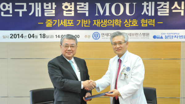 강남세브란스병원과 분당차병원은 18일 줄기세포 기반 재생의학 상호협력을 위한 양해각서를 체결했다. 강남세브란스병원 9층 회의실에서 개최된 체결식에는 강남세브란스병원 이병석 병원장, 정재준 부학장과 분당차병원 지훈상병원장, 함기백 연구부원장 등 양병원 관계자들이 참석했다. 양 병원은 이번 양해각서를 통해 향후 줄기세포를 이용한 임상연구, 난치성 신경계 질환 및 차세대 호발성 질환 치료제 개발, 기타 줄기세포 기반 재생의학 연구와 산업화를 위해 협력하게 됐다. 이병석 강남세브란스병원장은 “이번 MOU를 통해 강남세브란스병원과 분당차병원이 손을 잡고 국내를 넘어 세계 줄기세포 연구 분야를 선도하는 계기가 마련됐다”고 밝혔다. 지훈상 분당차병원장도 “최근 줄기세포 재생의학은 세계적으로 주목받는 분야로 양 기관이 힘을 합친다면 분명 괄목할 성과를 거둘 것으로 기대한다”고 말했다. 강남세브란스병원은 우수한 연구경쟁력과 인력을 기반으로 당뇨, 간, 척주, 근육병 등 다양한 분야에서 줄기세포를 이용한 연구에 크고 작은 성과를 거두고 있다. 분당차병원은 국내 줄기세포 연구 및 임상 분야를 선도하고 있으며 지난해 보건복지부로부터 연구중심병원으로도 지정받았다. 한편, 강남세브란스병원과 분당차병원은 이날 오후 2시부터 ‘줄기세포 기반 재생의학 실현을 위한 공동 심포지엄’을 개최했다. 강남세브란스병원 본관 3층 대강당에서 개최된 이번 심포지엄에는 연세의대 김동욱교수와 분당차병원 이동률 교수 등 국내 줄기세포 연구분야의 권위자들이 좌장 및 연자를 맡았고, 양 기관에서 모인 약 300여명의 연구자 및 의료진들이 참석했다. |