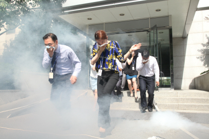 이번 교육 및 훈련은 위험 불감증을 불식시키고 다양한 재난에 대비한 안전교육을 통해 대형 사고를 예방하고 임직원의 안전을 도모하기 위한 취지로 실시됐다. 제약업계에서 재난 대피 훈련을 실시하는 것은 이번이 처음이다. 훈련 내용은 3층에 화재가 났다고 가정하고 층별 비상구 위치를 파악해 긴급상황에서 안전하게 대피할 수 있게 하는 것이다. 이날 녹십자 용인 본사에 근무하는 600여명의 임직원들은 ‘녹십자 자위소방대’의 안내에 따라 본사 밖 잔디 광장으로 대피했다. ‘녹십자 자위소방대’는 소방조와 대피조 그리고 의료조로 나뉘어 재난 발생 시 조기 대응 및 대피를 돕는 역할을 하는 사내 조직이다. 이와 함께 본사 사옥 밖으로 빠져 나온 녹십자 임직원들은 재난 유형별 대비법, 소화기 사용법, 응급처치를 위한 심폐소생술 실습 등 다양한 재난 대처법을 익혔다. 녹십자는 안전을 경영의 화두로 삼고 있다. 현재 생산공장에 배치된 안전관리 요원 외에 본사 차원에서 안전관리팀을 강화했다. 또 이달 초에는 전 임직원을 대상으로 안전교육을 실시했고, 지난 23일에는 재난 시 효과적인 조기 대응과 신속한 대피를 위해 ‘녹십자 자위소방대’를 편성해 소방대원의 임무교육을 진행했다. |