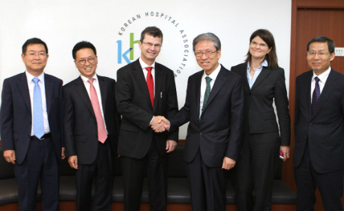 한국을 방문중인 가우스 CEO는 12일 병협회관을 방문해 병원협회 박상근 회장으로부터 최근 한국 의료시장의 현황과 병원들의 경영 상황에 대한 설명을 들었다. 이후 병원협회가 제안한 의료기기산업 활성화를 위한 공동 세미나 개최와 의료산업활성화 특별위원회에 참여키로 결정했다. 가우스 CEO는 "한국의 의료수준은 이미 세계적인 수준으로 최첨단 의료기기로 무장한 한국병원들은 국제적인 경쟁력이 충분하다"고 의견을 밝혔다. 그러면서 "해외환자 유치 및 세계 의료시장 진출에 적극적인 한국 병원들의 노력이 매우 인상적"이라며 국내 병원에 깊은 관심을 표명했다. 이에 박상근 회장은 "세계 의료기기 시장을 선도하는 지멘스사가 오는 9월 개최되는 K-Hospita Fair에 참가해 주신점에 매우 감사하다"며 향후 병원협회의 국제 및 국내 공헌 활동에 지멘스가 동참하여 주기를 희망했다. 약 1시간에 걸쳐 진행된 환담에는 엘리자베스 스타우딩거 아태지역 수석부회장, 박현구 한국지멘스헬스케어 대표가 배석했으며, 병원협회에서는 정영진 사업위원장, 서석완 사무총장이 함께 배석했다. |