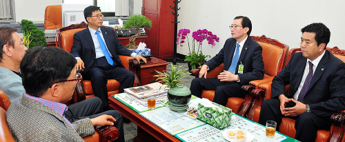 지난 10일 오후 4시30분께 의협 추무진 회장은 국회 본청 보건복지위원장실을 방문, 김춘진 위원장과 면담을 진행했다. 이날 추 회장과 김 위원장은 보건의료현안에 대한 의견을 교환했다. 의협에 따르면 이날 면담은 제 19대 하반기 보건복지위원회 구성이 된 이후 이뤄진 것이다. 한편 이 자리에는 전라북도의사회 방인석 의장, 전라북도의사회 김주형 회장, 강청희 의협 상근부회장이 배석했다. |