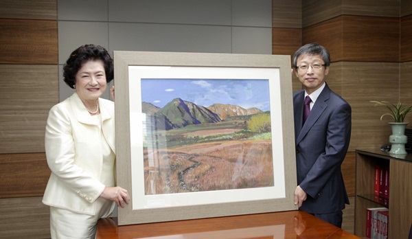 이번 서양화 기증식에는 김우경 의무부총장, 차상훈 안상병원장, 기부자 최창희 여사와 남편 문영목 전 서울시의사회장 등이 참석해 화기애애한 분위기속에 진행됐다. 최창희 여사는 "오늘로써 안암, 구로, 안산 3개 병원 모두에 애정이 깃든 작품을 기증하게 됐다. 모교병원의 발전에 조금이나마 기여한 것 같아 매우 기쁘게 생각한다. 환자의 쾌유를 기원하는 마음을 담은 만큼 그림을 보는 모든 분들이 행복해 지시기를 바란다"며 기증 소감을 밝혔다. 한편, 기증자 최창희 회장은 고대의대 29회 졸업생으로 1999년 제20회 '의인미전'에서 우수상을 받으며 화단에 데뷔했다. 2011년 9월 인사동에서 개인전 개최 등 왕성한 창작활동 중에 있다. 기증된 작품 '기억속의 산야'는 고객 및 교직원들을 위해 고대 안산병원에 전시될 예정이다. |